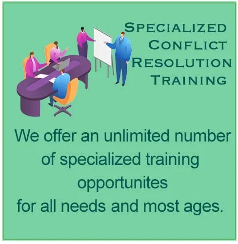 Specialized conflict resolution training is available in the form of shorter sessions geared for the following populations: teens, organizations, local government, church congregations, families, re-entry groups and prisoners. Specialized training modules are priced as follows: